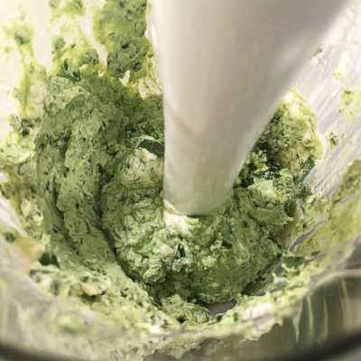 Alle Zutaten in einen hohen, schmalen Mixbecher geben und mit dem Pürierstab zerkleinern, bis der Käse gleichmäßig hellbrün ist.